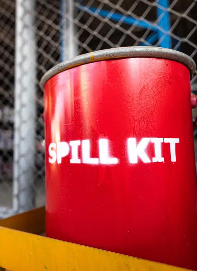 - Spill kits – Place absorbents, neutralizers, booms, and PPE in accessible locations near high-risk areas.